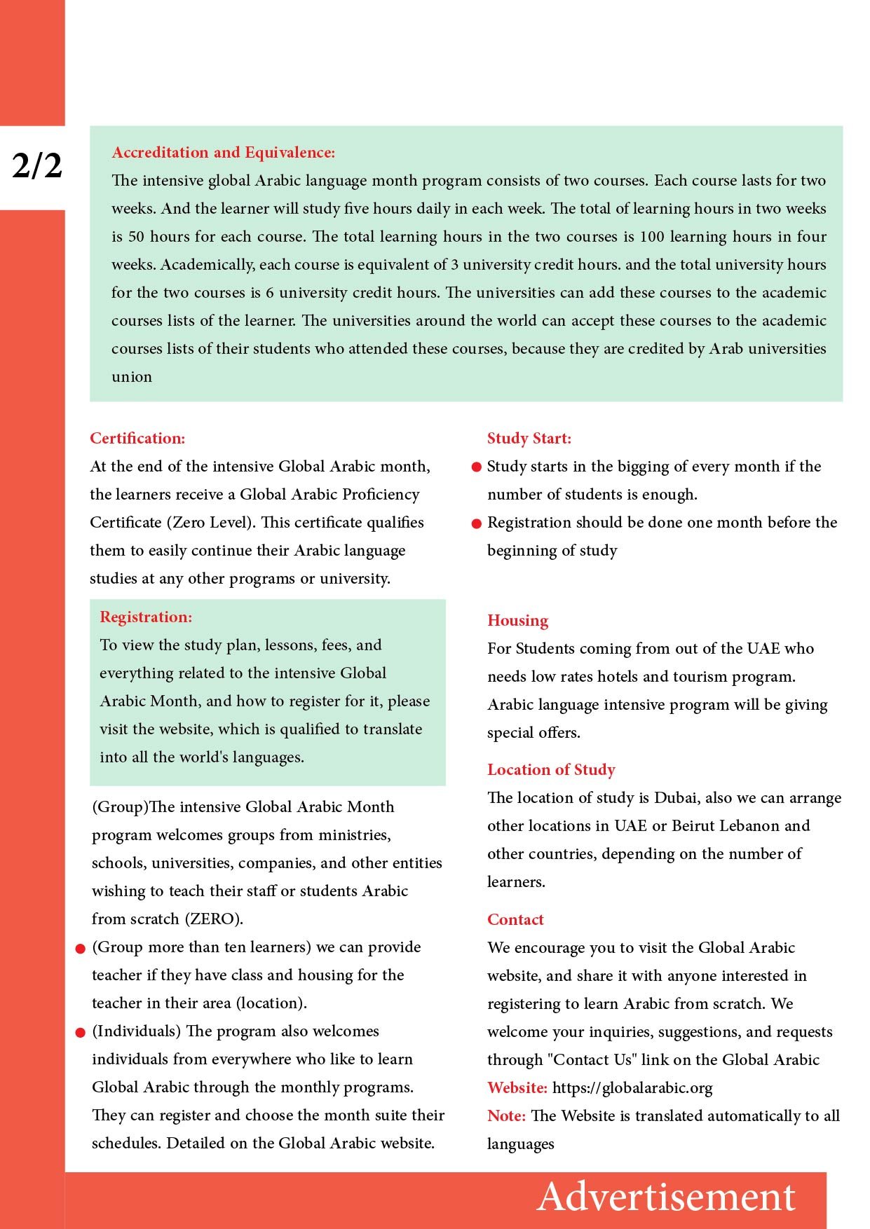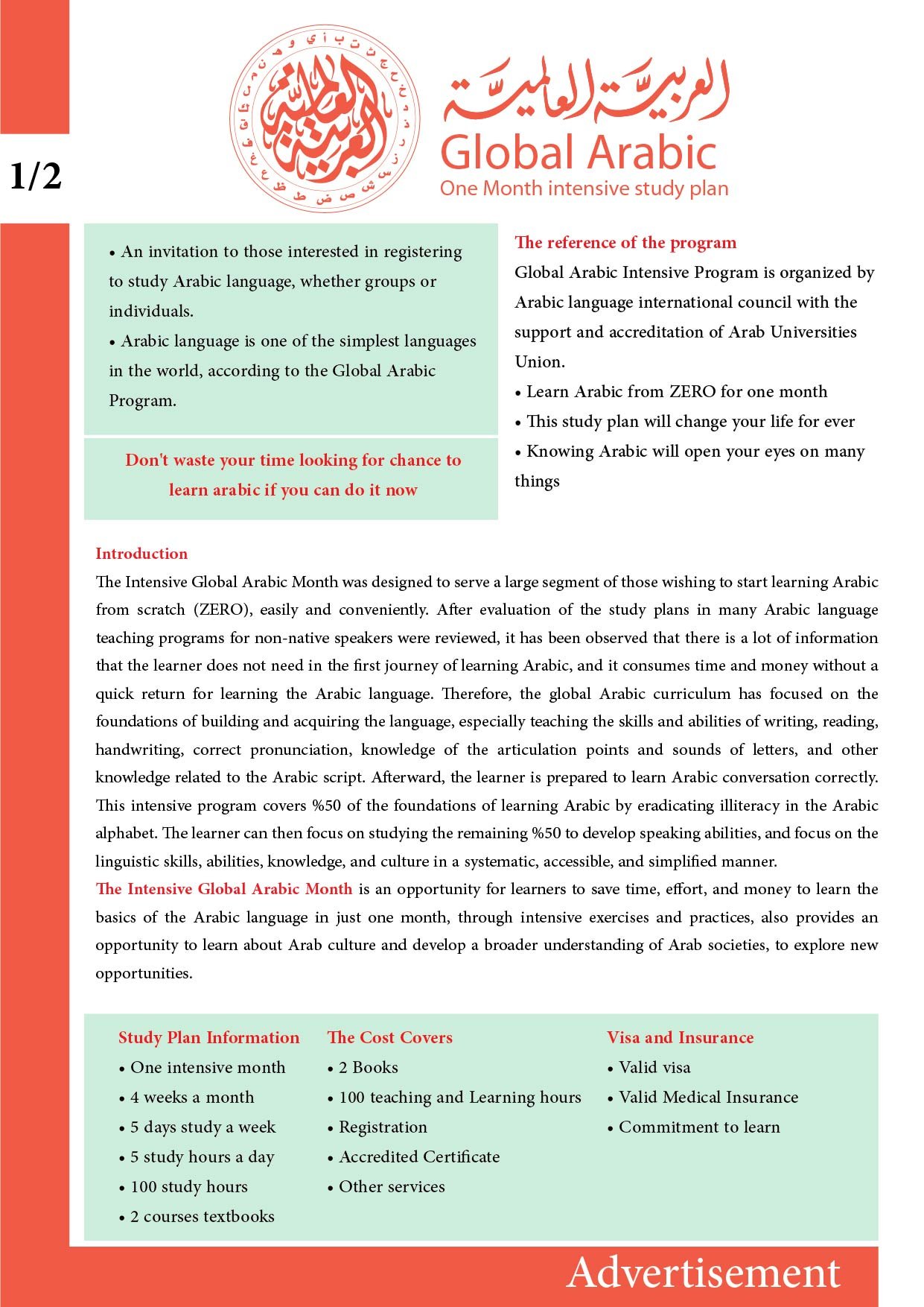 يعادل شهر العربية العالمية المكثف (6 ساعات) دراسية معتمدة للفصل الدراسي الجامعي (16 أسبوعًا دراسيًا)